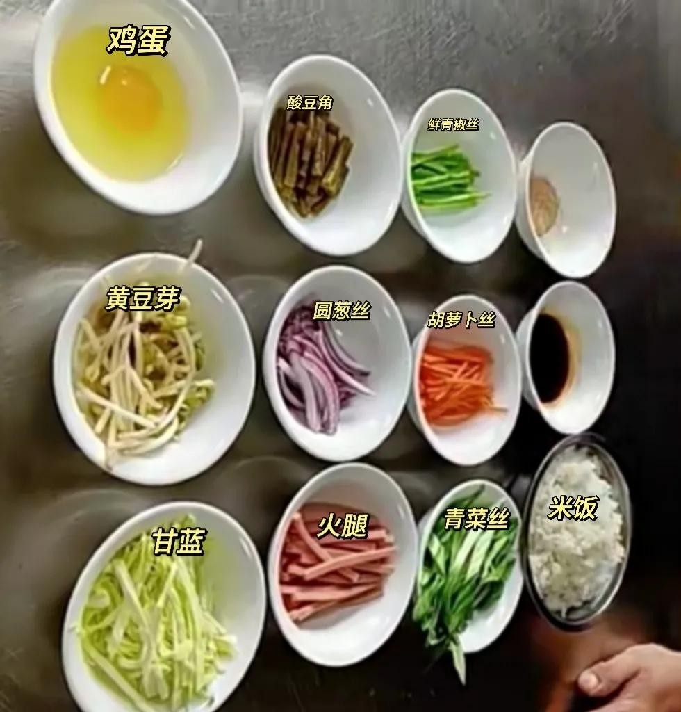 2、配菜:黄豆芽30克,甘蓝26克,火腿45克,紫圆葱切丝30克,酸豆角25克,油菜切丝30克,胡萝卜丝25克,新鲜青椒丝15克,一个鸡蛋打散,