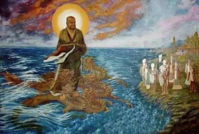 此典故在民间俗称,“老和尚过江”。佛教故事称之为,“一叶渡江”。