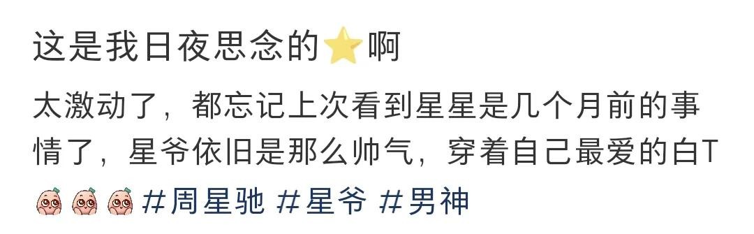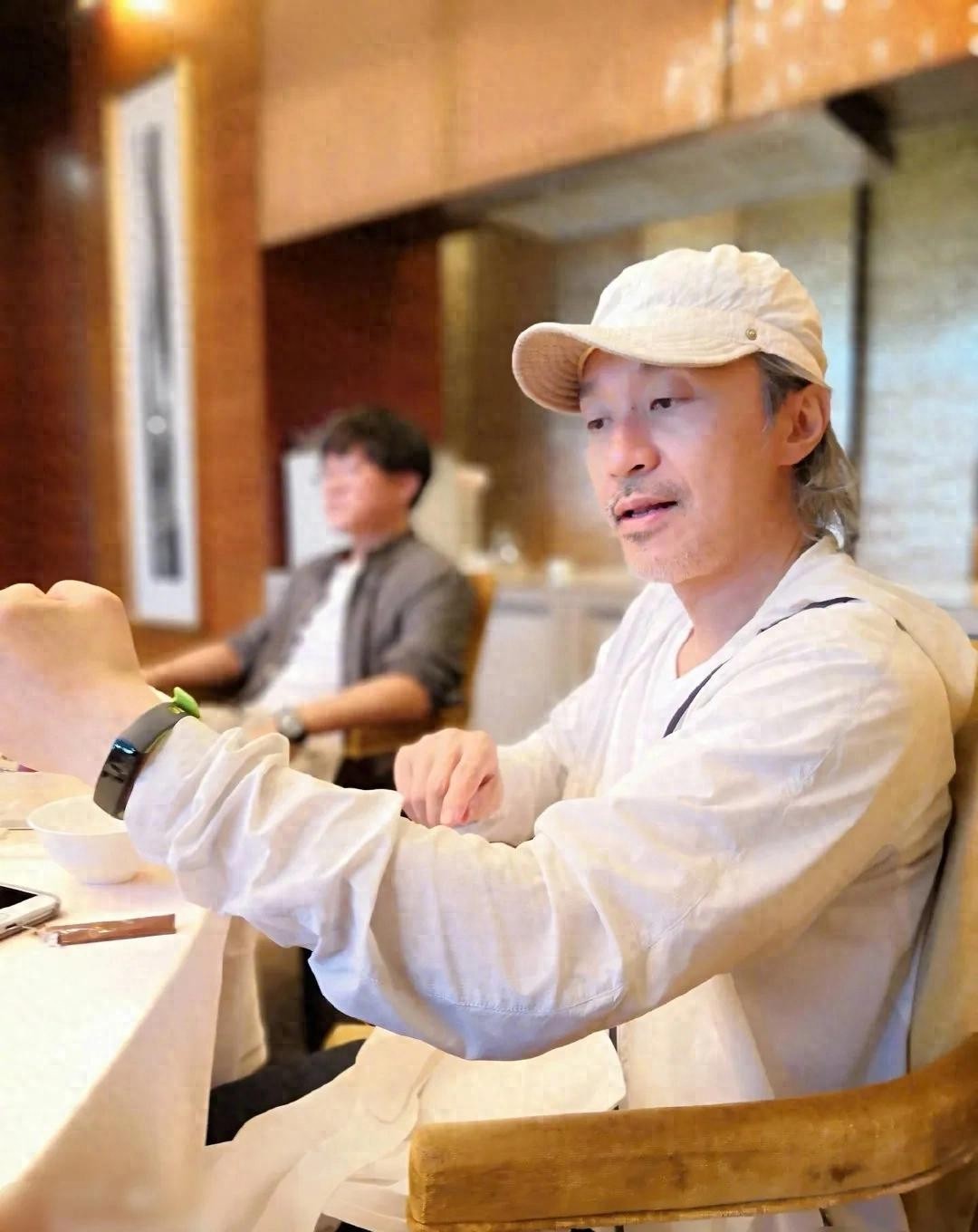 照片中,星爷白T黄帽黑框镜,低调装扮难掩岁月痕迹,双鬓斑白,但瘦削身躯里藏着满满精神头儿,状态依旧在线。