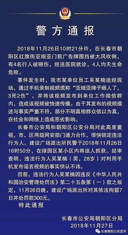 据警方通报显示,事件发生时,长春市某单位员工吴某楠途经现场,通过手机录制视频谎称“亚细亚牌子砸人了,3死2伤”,并将该视频发布到单位工作微信群内,造成该视频被快速传播。