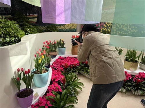 上午10点左右,天朗气清,春寒料峭,中山公园唐花坞里则是一片春暖花开的美景,粉色、紫色、黄色……不同颜色、造型各异的郁金香花开正好。“我就是从事花艺的工作,觉得这里的郁金香品种比日常见到的要多,那边有一个‘烁光’郁金香,日常不太常见,挺好的。”游客们徜徉其间,赏花拍照。“品种挺多,还有好些新的品种,造型也挺好,做的小盆景挺美的,很有意境。”“挺新奇的,挺惊艳的,这么早这么多品种的郁金香,布局和各种花的设计都很新奇,品种挺多的。”