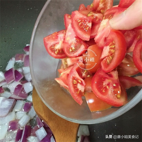 第四步:黄油融化后,先将洋葱放入煸炒一下,洋葱煸炒软后,将西红柿倒入一起煸炒,煸炒出汁。如果想要番茄味更浓郁一些,可以再加点番茄酱,亦或是西红柿的量要多一些,这样汤底更酸甜浓郁好喝。