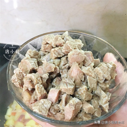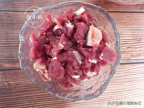 第一步:我们先将牛肉切成小块,我喜欢将牛肉切成细丁,不仅炖煮时候容易熟也更入味软烂入味。