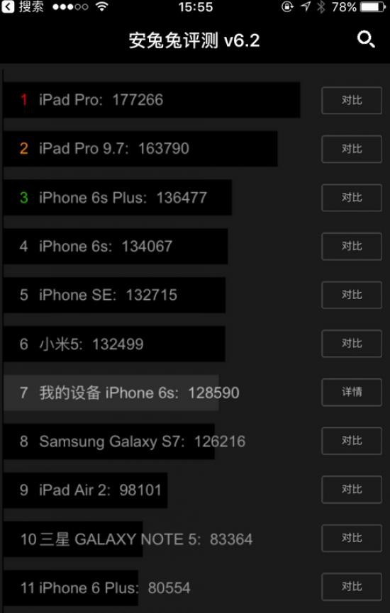 从数据上来看,iPhone 7搭载的A10处理器的跑分达到了178397分,与之前iPad Pro的177266分相比相差不多,目测安兔兔的排行榜中暂时是不会有比它再高的了。