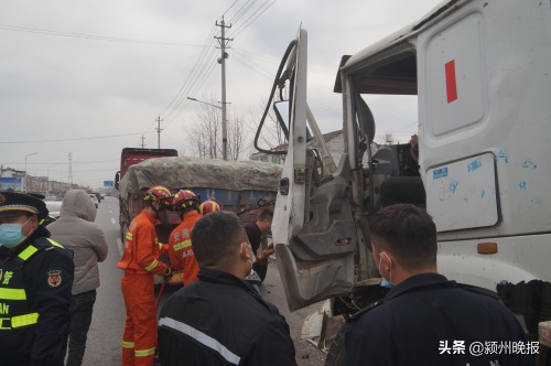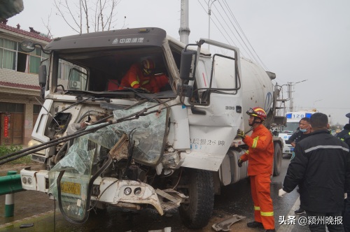 3月5日上午11点左右,安徽省阜阳市颍东区袁寨高速路口发生一起交通事故,一辆水泥罐车追尾一辆半挂,水泥罐车司机被困,辖区消防大队立即前往救援。