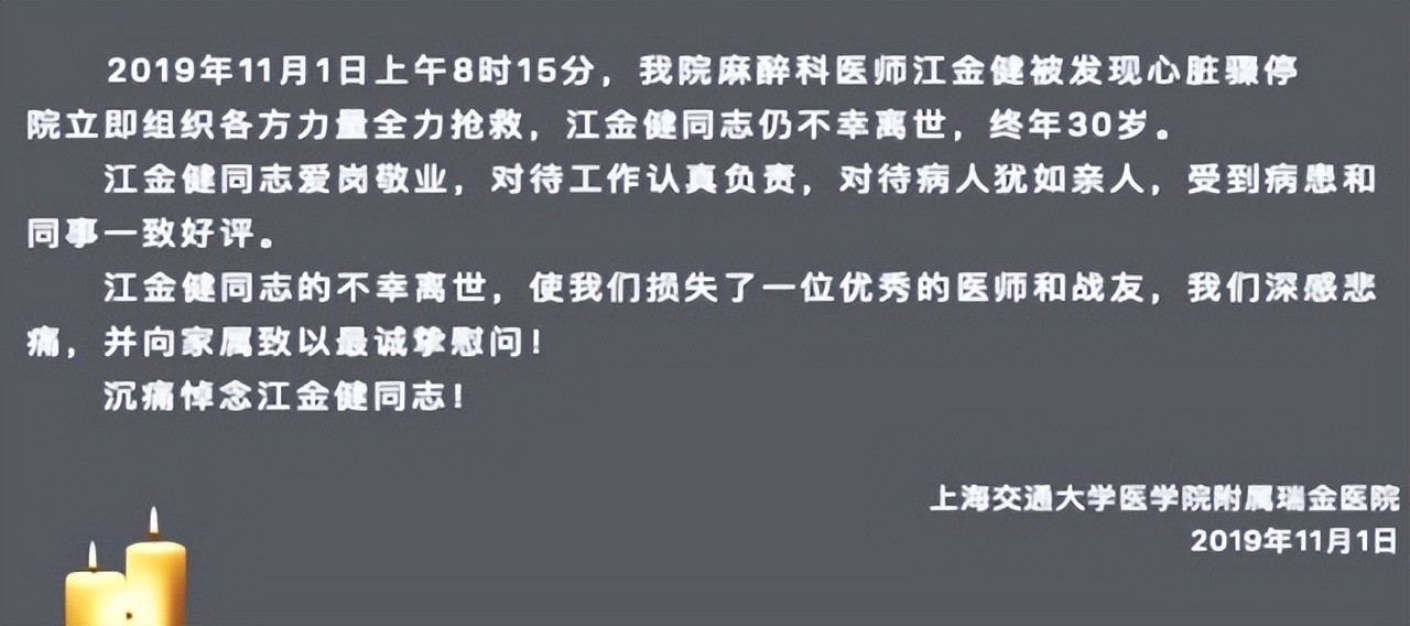 2017年,年仅26岁的麻醉师陈德灵,因劳累而猝死在岗位上;2019年11月1日上午8时15分,麻醉师江金健被发现心脏骤停,经抢救无效死亡,终年30岁。
