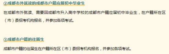 户籍在成都市,但学籍在成都市外的“回城生”,以及成都市户籍的“往届生”都需在户籍所在地区(市)县招考机构报名,并参加各项考试。