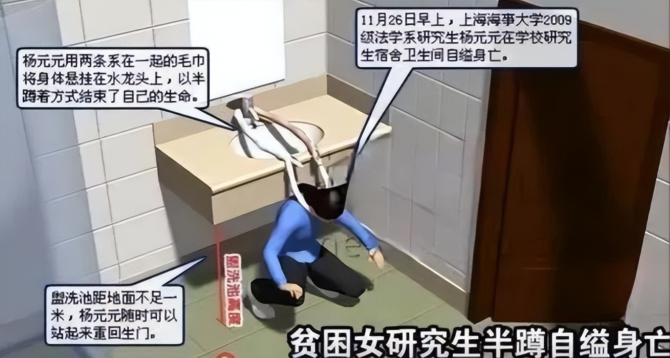 2009年11月26日,在上海海事大学商法专业研究生宿舍里的卫生间里,杨元元用系在一起的两条毛巾挂在水龙头上,将自己的身体半悬在其中,窒息而亡。