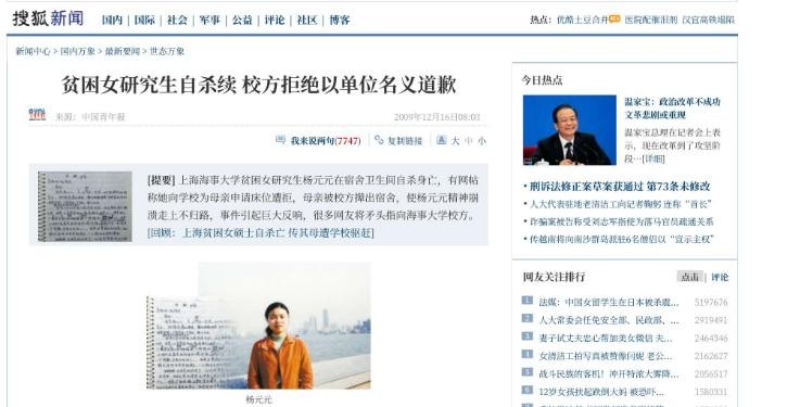 贫困女研究生自杀续 校方拒绝以单位名义道歉.搜狐网2014-10-8