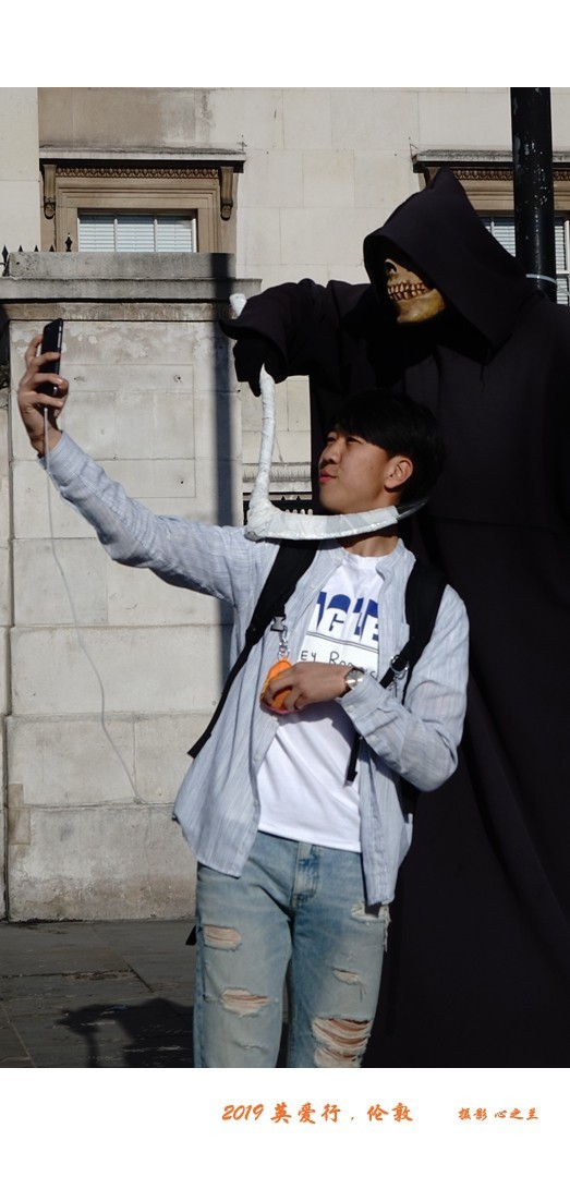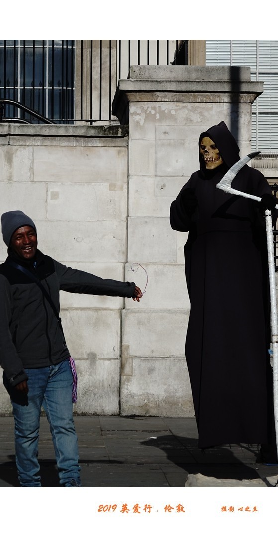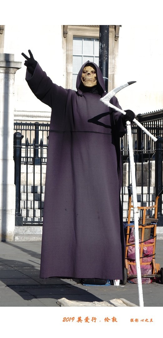 特拉法尔加广场不仅是伦敦的文化中心,也是市民活动中心,鸽子虽然没有了,但其他行为艺术还是存在的。我们就在广场上看到了这个拿着一把镰刀的“僵尸”。