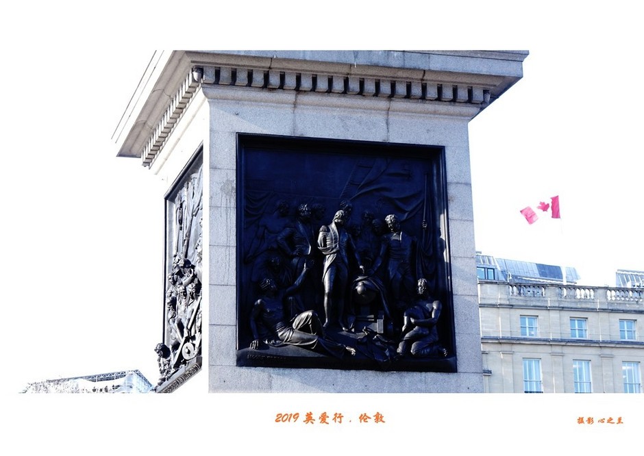 台座上的大幅浮雕,描绘了纳尔逊四次著名的海战场景。整个台座是用法国军舰的大炮铸成的。正面那幅雕塑,表现的就是特拉法加海战(1806年)。