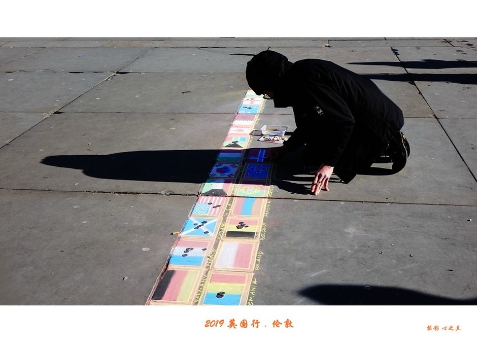 涂鸦也是广场“一景”,地当纸,天做伴,游人随便看。这个小伙子有才情,画的是各国国旗,还真有不少人给他小费。可我没看到五星红旗,这小费就先不给了吧。