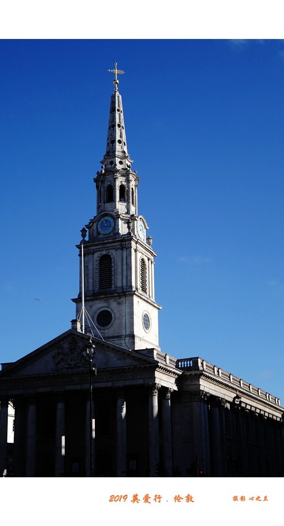 圣马丁教堂是詹姆斯(James Gibbs)在1726年完工的作品,但其历史可远溯至13世纪。它的外部造型美观,有一座56米高的尖塔,使教堂看起来更加宏伟壮观。在第二次世界大战期间,因教堂密室防德国闪电战空袭庇护所而出名,它现在是白金汉宫教区教堂,东头有皇家专用房间。