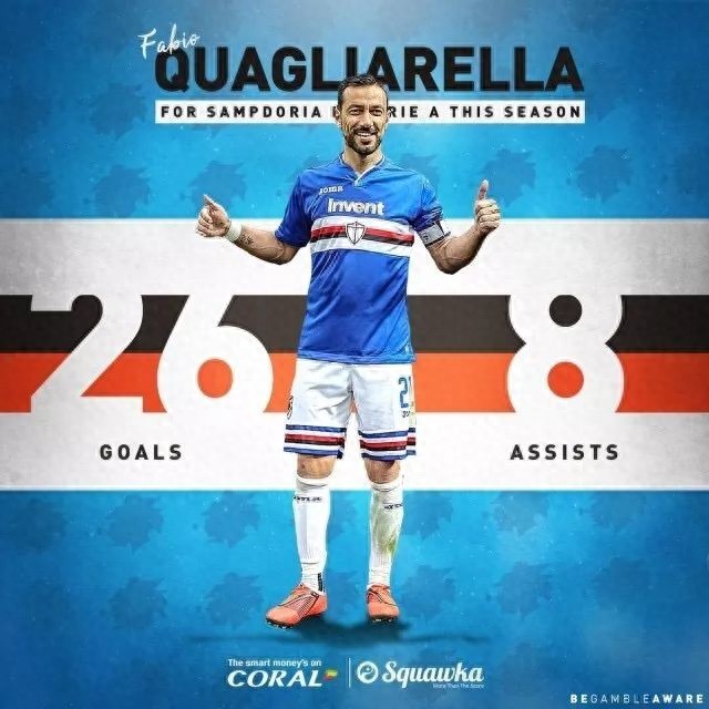 35岁的胡布内尔、33岁的迪纳塔莱、38岁的托尼之后,意甲“老金靴”史册上添上了36岁的夸利亚雷拉。尽管在意甲末轮并未进球,但夸利亚雷拉最终仍以26粒进球捧走意甲金靴,成为1990-91赛季的维亚利之后,首位荣膺意甲最佳射手的桑普多利亚球员。