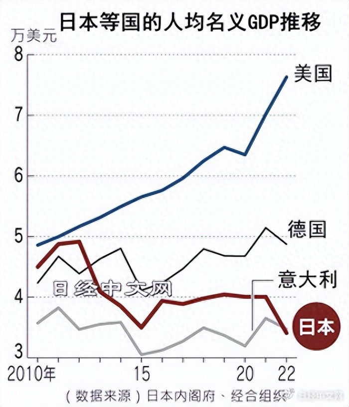 这是日本自2008年以来首次在G7中垫底。意大利的人均GDP为3.4733万美元。从中长期来看,日本的排名呈下降趋势。