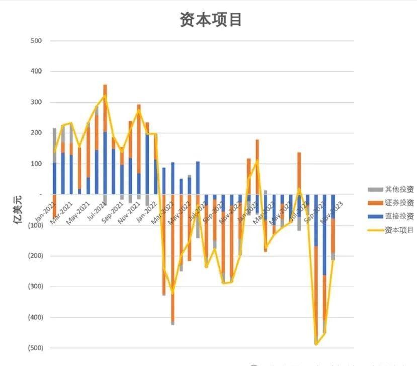 根据国际金融协会(IIF)的数据,海外投资者的股票和债券市场的资金净流出及净流入,2023年中国截至12月19日净流出845亿美元。与2022年相比,流出额增加了44%。截至11月初,中国净流出781亿美元,而不包括中国的新兴市场吸引了2147亿美元的净非居民组合流入。