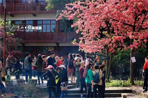 与一树树盛放的红樱花相映成趣