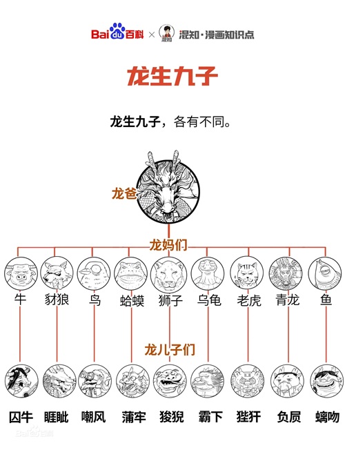 囚牛,睚眦(yá zì),嘲风,蒲牢,狻猊(Suān ní),赑屃(bì xì),狴犴(bì àn),负屃(fù xì),螭吻(chī wěn)