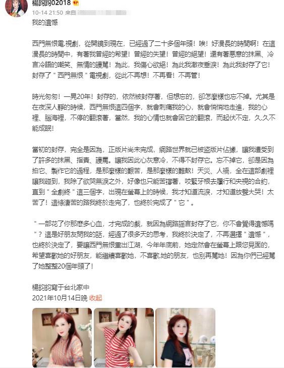 还称要在年底之前让这部《西门无恨》重出江湖,让大家期待。