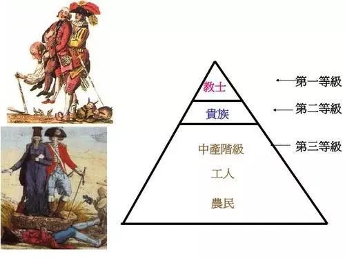 在革命前,法国的居民被分成三个等级:第一等级:天主教高级教士。(国王不属于任何阶级)第二等级:贵族。第三等级:包括资产者、农民、无产者在内的市民、下层人民,除第一第二等级外其他阶层。