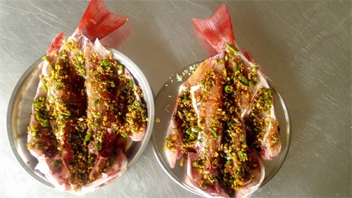 中午宴请唐爽和监理李某杰、地主、浩子等四人吃鱼。蒸出第一条上桌,第二条下锅,两条小的一盘第三锅。李监理说:我是来学蒸鱼的。
