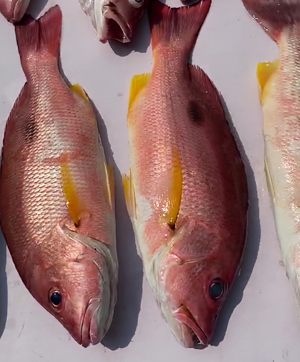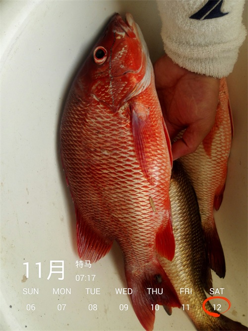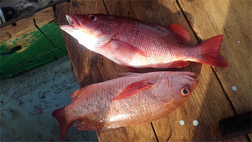 06:50,艾曼纽拎起一个白色的塑料桶,从桶里掏出两条红笛鲷摆在船横隔板上,一条紫红笛鲷,一条红笛鲷,每条将近二斤的样子。紫红笛鲷腮部一吸一合,还活着,应该是刚出水不久。那条鲜红的笛鲷已经张大嘴,鱼的眼睛依然明亮有神,按压鱼身弹性十足,预计出水时间也不长。拿起紫红笛鲷,软糯的身体柔滑异常,再看那条明艳的红笛鲷,犹如胭脂惜桃花,淡扫蛾眉朝至尊,惹人垂怜。