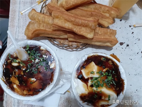 我俩来到一个东北人开的早餐店,油条3块钱一根,豆腐脑也是3块钱一碗,豆浆是2块钱一碗,各种馅的包子和大碴子粥和白米粥等,粥2块钱一碗,包子素馅的1块5一个,肉馅的3块钱一个。