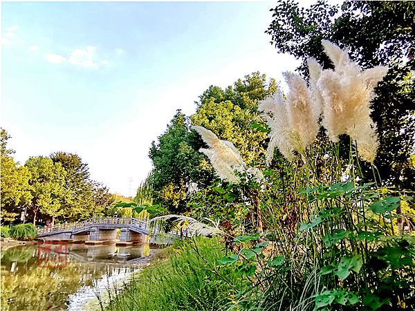2020年9月2日的武汉市堤角公园内野趣横生。为打造堤角公园“江南水乡”景致,1998年堤角公园开挖了约3.2公顷的人工湖,湖畔种植了垂柳、夹竹桃等植物。湖中种植荷花、菖蒲、鸢尾、千屈菜等水生植物,既起到了净化水质的作用,又丰富了湖岸生态。
