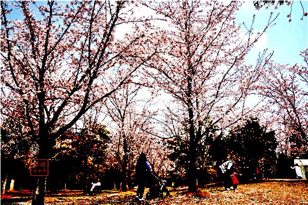 堤角公园樱园的樱花季,不少游人带着小朋友们在这里流连忘返。