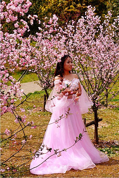 春天堤角公园的樱花树下,美艳新娘正在拍摄婚纱照。