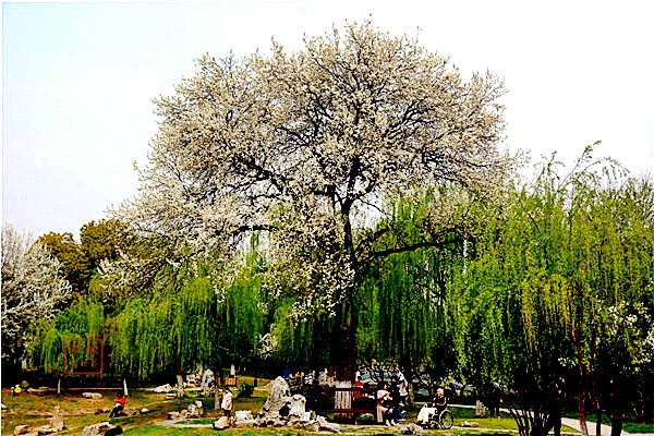 春天,堤角公园内的这棵有着数百年树龄的豆梨树开花了,游人聚在这里领略最美妙的春光。