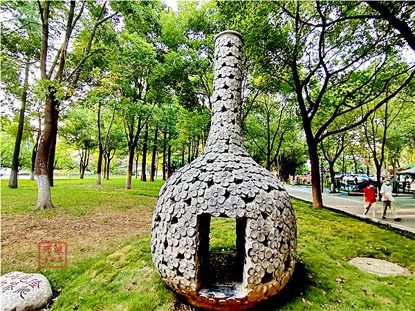 武汉堤角公园风格独特的花瓶式雕塑。摄于2020年9月2日。