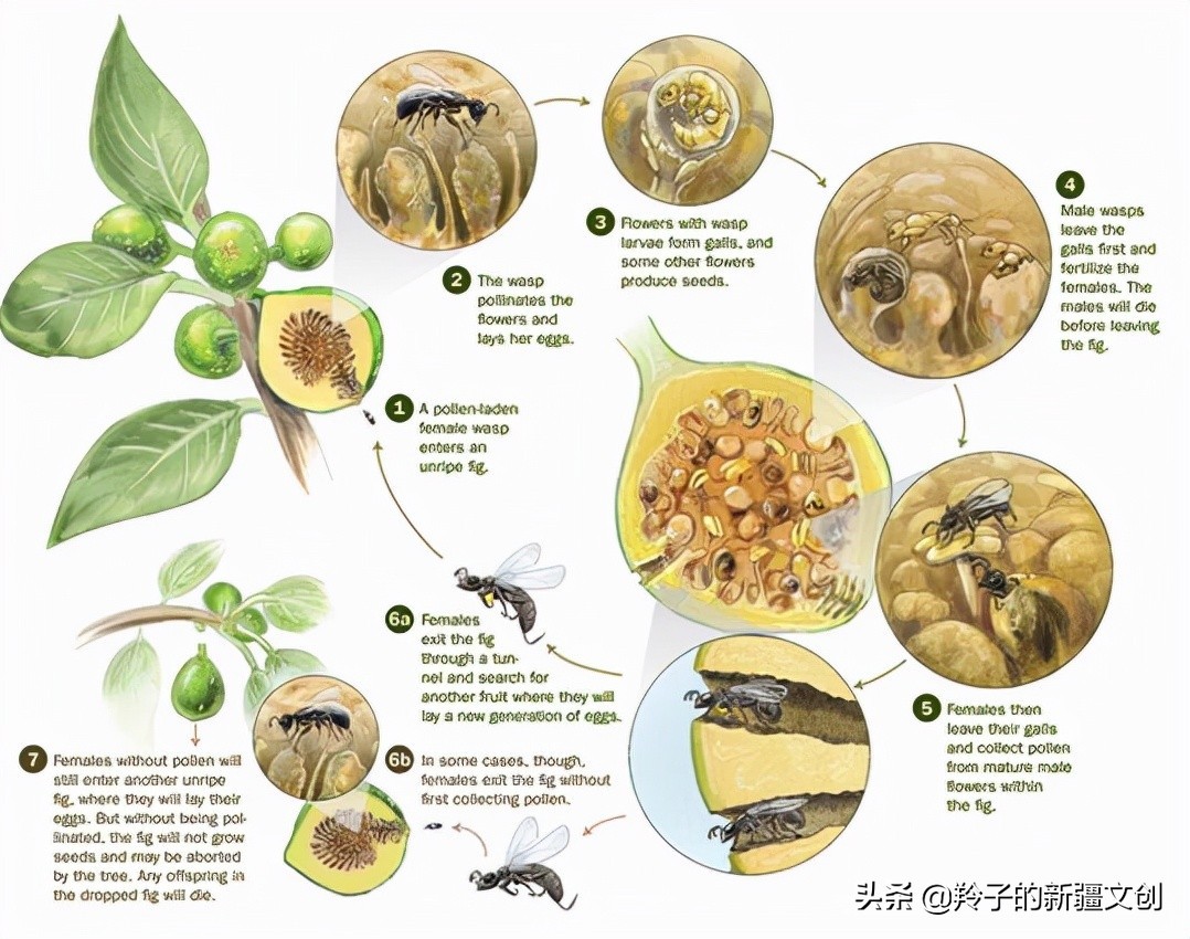 常识告诉我们:花朵不经过授粉是长不出果实的。那么,无花果是如何授粉的呢?原来,无花果的小花虽然被花托包裹,但在果柄对面仍留有一个秘密通道,一个几乎看不见的小洞。通过这个狭窄的小孔,一种名叫无花果蜂的小昆虫能进入果实内部,在里面产卵。幼虫发育、长大,从一朵花爬到另一朵花,成为授粉的“经纪人”。