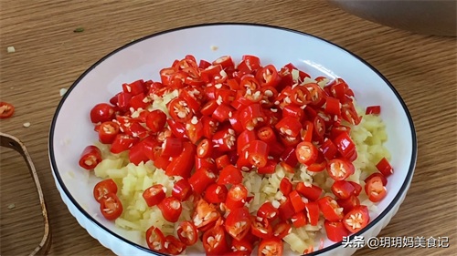 3,腌豆角必不可少的就是大蒜,拍一下剁碎,生姜切成末,小米辣切成圈