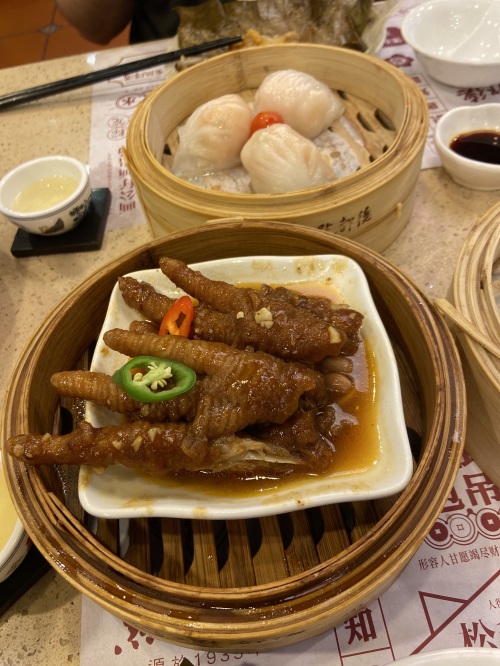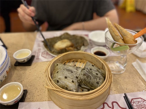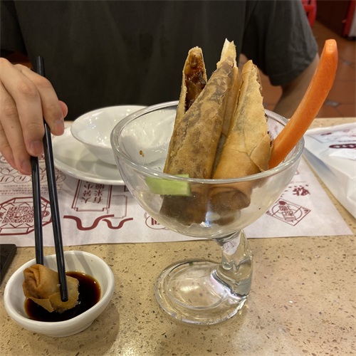 因为我们俩都不太饿,所以这次只点了5个菜。鸡丝炸春卷,糯米鸡,百合酱蒸鸡爪,金牌虾饺皇和香芒夹心椰汁糕。最先上的是鸡丝炸春卷,炸的脆脆的,酥酥的,很香。如果觉得有点油,腻的朋友可以多蘸一点醋,味道还挺不错。20元一份的价格蛮实惠的。