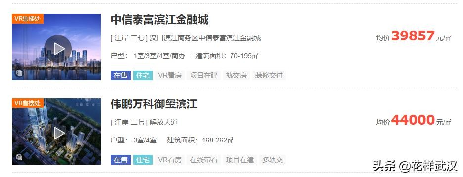而高贵、商务、时尚也成了这个区域最佳的代名词。开盘的新楼盘,二手房,也不断刷新武汉楼市的新高度。中信泰富滨江金融城,均价39857元/平;伟鹏万科御玺滨江,均价44000/平米,绿城武汉黄浦湾,均价48175元/平。而武汉天地的二手房均价,常年在5万多一平,部分已经逼近6万元。