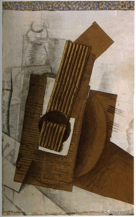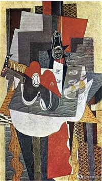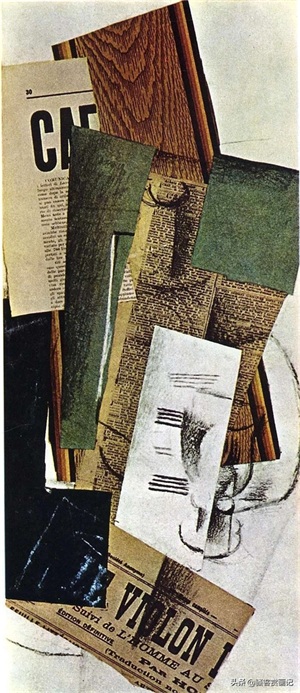 特别要提到的是布拉克从1912年开始尝试拼贴画创作,这时期的作品简洁大气,他得心应手地在抽象与具象的自由转换中表现他的主题。其中创作于1913年的《单簧管》是拼贴画的代表作:木纹纸、报纸及有色纸,的有机统一的组合,使得客观的物象与抽象的思维相互和谐、融洽,这与分析立体主义的风格是很不同的,这也是我们为什么在欣赏布拉克绘画时会感受到一种平衡的原因。