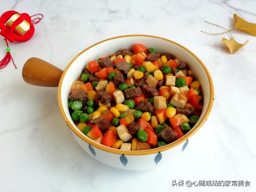 时蔬炒牛肉的做法:牛肉洗净,切成小粒,加入适量料酒、生抽、蚝油、生粉、花生油,抓拌均匀,腌制5分钟。香干洗净,切成小粒;玉米洗净,把玉米粒一排排剥下来;豌豆去壳洗净;胡萝卜去皮洗净,切成小粒。热锅倒油,放入牛肉爆炒至变色,盛出;放入香干煎香,盛出;放入豌豆、胡萝卜、玉米粒翻炒一会,倒入适量清水煮熟;放入香干和牛肉混合,加入适量盐炒匀即可。