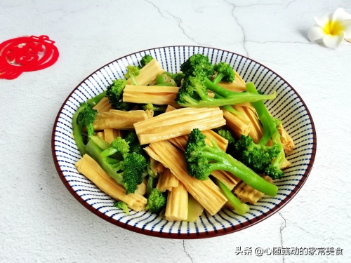 西兰花炒腐竹的做法:腐竹冷水泡发,洗净切好。西兰花洗净,切成小块放入开水锅中,淋入适量花生油,焯水1分钟,捞出过凉,沥干水分。热锅倒油,放入西兰花和腐竹爆炒一会,加入适量盐和生抽炒匀即可。
