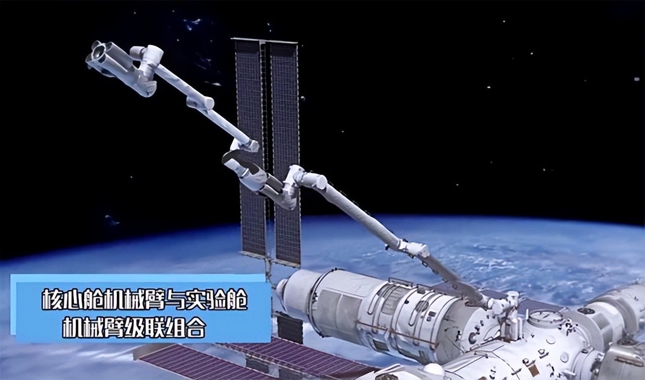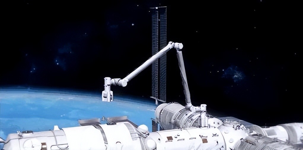 中国空间站的机械臂最长可达18米,有7个关节,如果用我们人类的手臂来打比方的话,它有三个肩膀,一个手肘,三个手腕,而且还可以跟其他小型的机械臂对接变长,可以承载25吨的大型航天器。