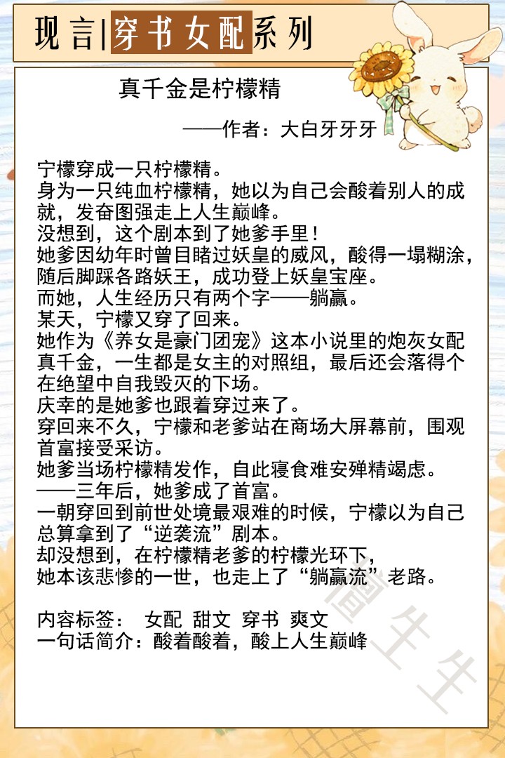 小短评:简单来说,就是小柠檬精回到穿前的世界,原来她是一本豪门狗血文中的真千金,是充当男女主爱情的炮灰。穿回来的柠檬精懒理家里的极品们和小白莲女配,而是自食其力在娱乐圈闯荡,在这里和大柠檬精爸爸会和,大柠檬精爸爸是一个才貌双全的影帝,无意看到某首富访谈后,柠檬精发作立下falg发奋图强争当首富。女主在娱乐圈沉沉浮浮,幸得柠檬精爸爸和隐形大佬男主守护,最终拿到最佳女主角奖项。