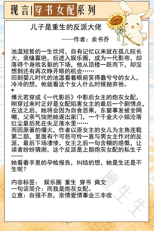 小短评:女主穿书,与影帝男主有了一夜后,逃到小村庄把未来的反派大佬生下,然后就是很温馨很快乐的养娃日常,为了生计女主搞起了养花直播,反派大佬重生成婴儿,最初意难平,恨女主将他抛弃,后来发现不是被抛弃,而是女主被人杀了。这个事实令反派大佬放下心结,更加黏妈妈。男主喜欢养兰,会看女主的直播,由于女主直播没露脸,所以没认起她来,彼此生活中没交集。后来参加一档综艺节目在女主村庄拍摄,第一眼就认出女主,渐生情愫去调查当年真相,原来一切都是女主家的豪门恩怨惹的祸。结局当然是恶人有恶报,男主努力追求女主……