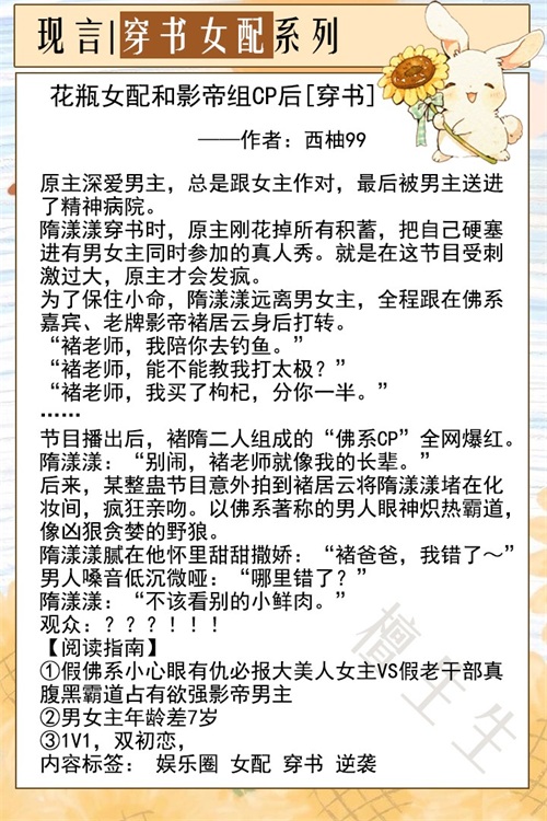 小短评:穿书娱乐圈甜宠文。女主穿成娱乐圈黑红花瓶,最初是因为一档生活类综艺节目,展现出不一样的自己吸粉无数,也与影帝男主相识相恋。整体来是一本略平淡的书,我看完了发现只有这档综艺节目解决了女主的爱情,复仇打脸逆袭全部剧情。喜欢这类书的去看看吧,近期完结的高分穿书文,必能有过人之处吧!