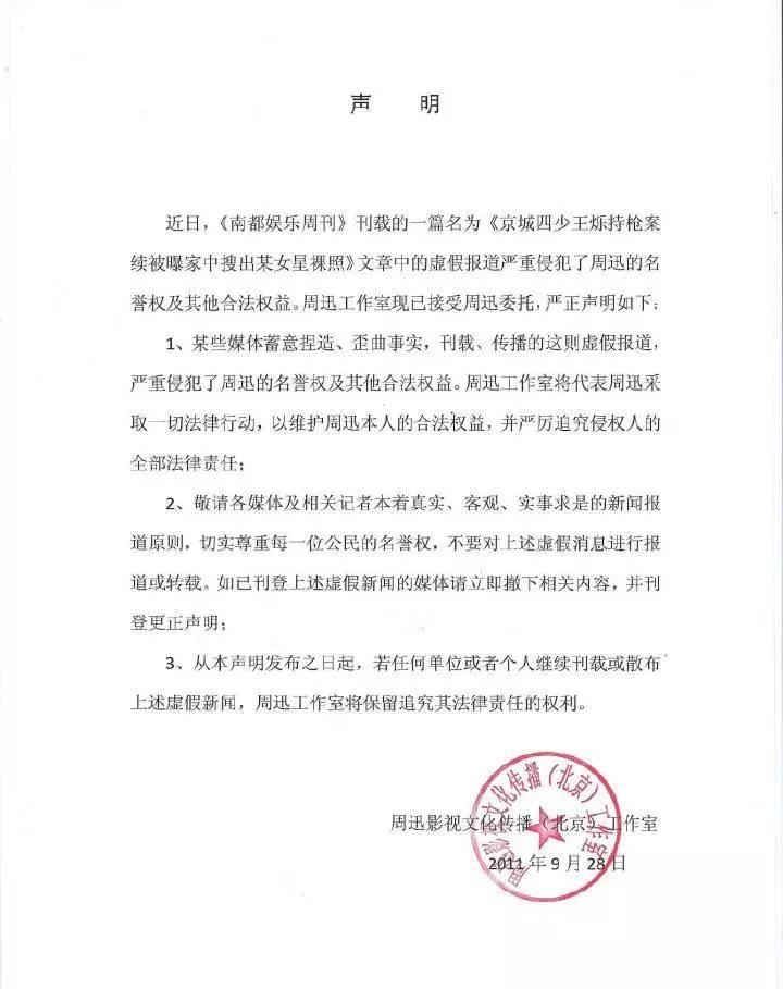 周迅的工作室当即发声明否认,并谴责当时爆料此事件的南都娱乐造谣,要求其删文道歉。