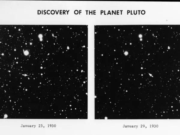 正是通过这些照片发现了冥王星,图中微小箭头标明了冥王星的运动(位置变化)