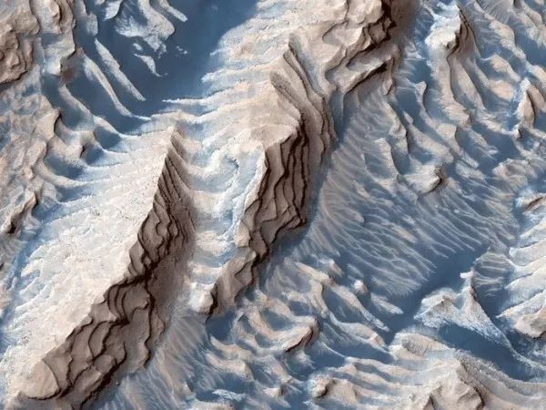 火星侦察轨道飞行器的图像显示了火星上42英里宽的撞击坑内的沉积岩石和沙子