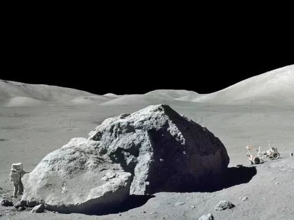 1972年12月13日,最后一次阿波罗飞行任务中,宇航员哈里森·施密特站在月球上一块巨石旁边