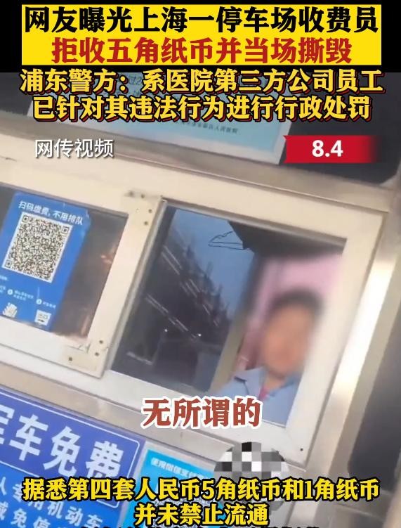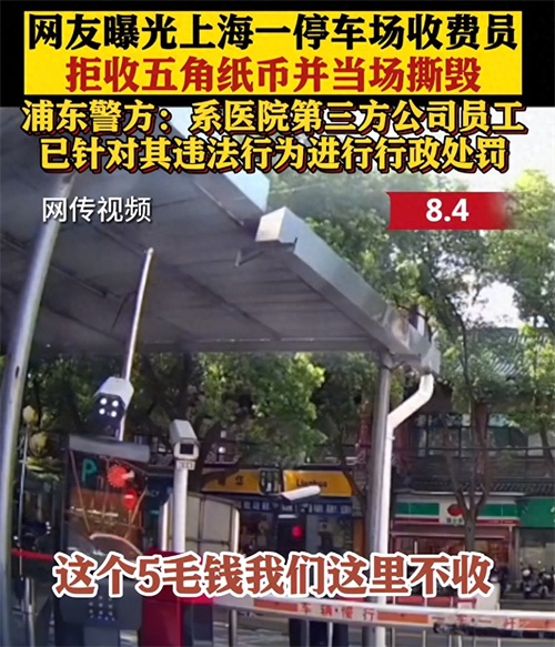 医院停车场收费员,公开撕毁5毛人民币,或遭罚款,工作恐怕也将不保。