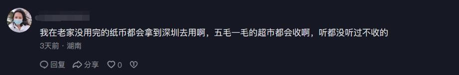 还有网友说,自己在老家没花出去的纸币,拿到深圳去,照样能买东西,根本就没听说过,有人拒收人民币的事情。