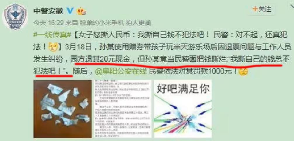 此前,安徽阜阳就发生过一起女子撕毁20元人民币后被罚款1000元的案例。
